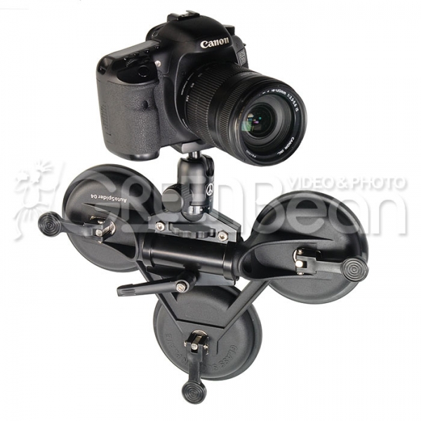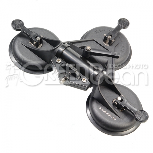 Auto Spider 04 на трех присосках, предназначен для закрепления камеры и другого оборудования внутри или снаружи любого помещения и транспортного средства (автомобиля, поезда, катера и т. д.), на элементах с гладкой плоской поверхностью пригодной для закрепления вакуумных присосок. Все элементы Spider 04 устойчивы к любым атмосферным воздействиям. Рабочая нагрузка до 10 кг. Три присоски, диаметр каждой присоски 120 мм. Установочное крепление для штативной головы - 3/8", возможность поворота крепления вокруг центральной оси. Тип помпы – рычажная. Механизм помпы изготовлен из алюминиево-магниевого сплава, присоска – из маслобензостойкой резины.