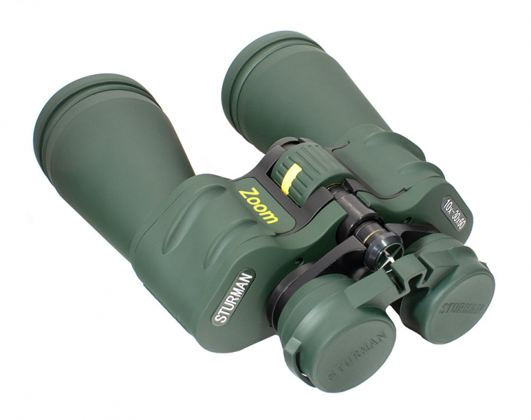 Конструктивные особенности бинокля Sturman 10-30x60Благодаря особенностям конструкции бинокль Sturman 10-30x60 позволяет вести наблюдения за протяжёнными или движущимися объектами, оставаясь на одном месте. Нужно только изменить кратность (в диапазоне от 10х до 30 х) с помощью специального рычажкового механизма и объект снова будет в поле Вашего зрения. При смене увеличения меняется значение таких параметров как диаметр выходного зрачка, светосила и поле зрения. Использование классической оптической системы на базе Porro призм помогает получить объёмное изображение при минимальных потерях света. Многослойное просветляющее покрытие, нанесённое на поверхности линз, увеличивает общий уровень светопропускания и обеспечивает яркое и контрастное изображение с естественной передачей цвета. Благодаря наличию механизма центральной фокусировки с функцией диоптрийной коррекции правого окуляра, а так же возможности регулировать межзрачковое расстояние Вы можете настроить бинокль в соответствии с особенностями Вашего зрения. Классический корпус Sturman 10-30x60 изготовлен из сплавов алюминия, тубусы объективов – из ударопрочного пластика. Нескользящее резиновое покрытие позволяет с удобством держать прибор в руках во время наблюдения или транспортировки. Бинокль имеет вес более 1 кг, что будет достаточно ощутимо при длительных наблюдениях с рук. Поэтому для обеспечения удобства эксплуатации и собственного комфорта рекомендуем Вам установить Sturman 10-30x60 на штатив (диаметр крепления ¼ дюйма) с помощью специального адаптера (входит в комплект поставки). Комплектация бинокля Sturman 10-30x60Поставляется в комплекте с защитными крышками объективов и окуляров, ремешком и футляром для хранения. Штативный адаптер входит в комплект. Технические характеристики бинокля Sturman 10-30x60