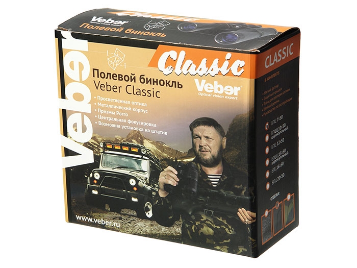Бинокль Veber Classic БПЦ 7x50 имеет классические «военно-морские» оптические характеристики. Широкое поле зрения позволяет легко обнаружить и удерживать цель в поле зрения, например, при качке. Линзы объектива имеют диаметр 50 мм (они собирают в 2 раза больше света, чем линзы диаметром 35 мм), это позволяет вести наблюдение в глубоких сумерках. Бинокль Veber Classic БПЦ 7x50 имеет металлический корпус и трудноистираемое просветляющее покрытие на линзах объективов и окуляров.
