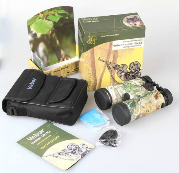 Этот бинокль спроектирован специально для охотников и учитывает их потребности в оптике, не заставляя переплачивать за лишнюю роскошь. Изюминка бинокля - двойной мост. Это значит что удары от небрежного обращения не повлияют на настройку прибора. Для этого бинокля выбрано классическое увеличение - 10 крат. При этом широкое поле зрения прибора позволяет легко обнаружить цель и рассмотреть ее во всех деталях. Светосильные объективы диаметром 42 мм позволят использовать его в сумерках. Бинокль имеет диоптрийную подстройку (она поможет если у вас плохое зрение) и выдвижные бленды окуляров, благодаря которым можно смотреть в бинокль в очках. Корпус десятикратного Veber Hunter выполнен в противоударном пластике. Этому биноклю не страшна влага.