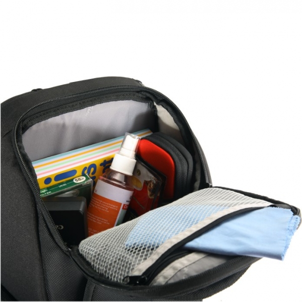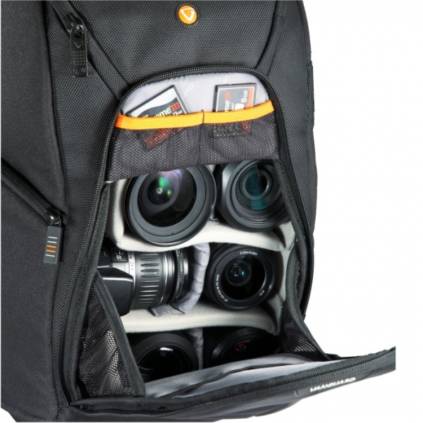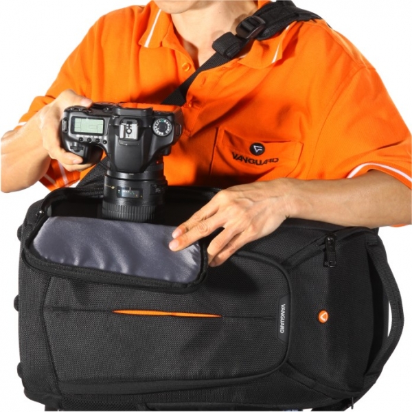 VANGUARD 2GO 46 - недорогой рюкзак средней вместительности. Вмещает зеркальный фотоаппарат с установленным объективом + еще 4-6 объективов или вспышек. Фотоотделение располагается в нижней части, с доступом через переднюю или через боковую стенку; верхнее отделение предназначено для личных вещей, также присутствует отделение для небольшого ноутбука с диагональю до 13".
