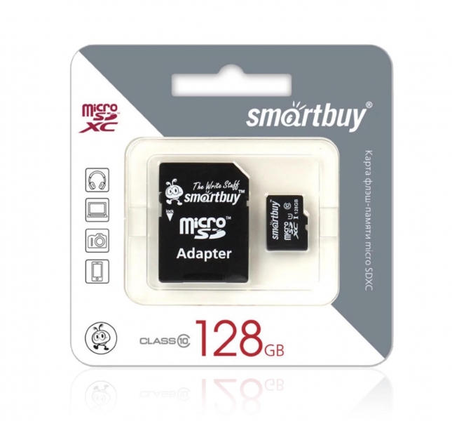 Карта памяти с адаптером 128Гб Class 10: скорость передачи данных 10 МБ/с Доступная емкость: 128 ГБ Комплектация: карта, адаптер |
