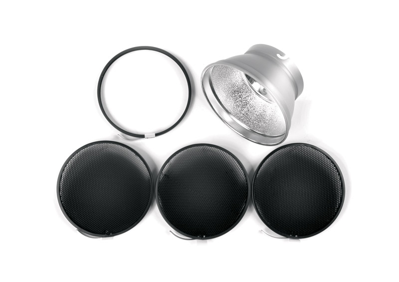 Набор круговых сотовых насадок включает в себя сам рефлектор (арт.26144, тип: 18 см, 60°), насадку 30° (арт. 26100), насадку 20° (арт.26101), насадку 12° (арт.26102) и держатель для цветных фильтров (арт. 26132).