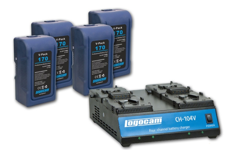 Энергоемкий комплект электропитания для камкордеров с креплением аккумулятора V-Lock. В состав комплекта входят: Аккумуляторные батареи V-Pack 170 — 4шт.; Четырехканальное одновременное зарядное устройство CH-104 V. |