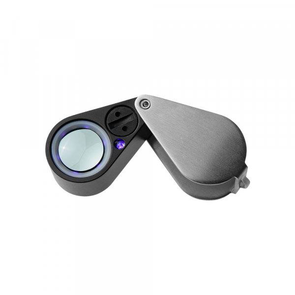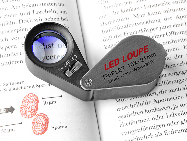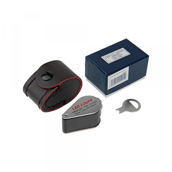 Лупа Veber 7802 (10х, 21мм) Корпус лупы и оправа изготовлены из металла. Сверху на оправе предусмотрен переключатель подсветки: подсветка поля зрения линзы и УФ подсветка. На нижней части оправы (вокруг линзы) расположены 6 УФ светодиодов и ещё один более мощный УФ светодиод расположен около батарейного отсека. Также на нижней части корпуса находится отсек для батарейки под винтовой крышкой. Шесть светодиодов белого света так же расположены вокруг линзы и имеют высокую яркость, тем самым обеспечивают комфортное наблюдение даже самых мелких деталей камней, ювелирных и других изделий, имеющих рельефную поверхность. Линза лупы изготовлена из оптического стекла и представляет собой склейку из трёх оптических элементов. Благодаря этому, создаваемое изображение абсолютно лишено окраски и искажения по краям поля зрения. Для замены батарейки в лупе, в комплектации предусмотрен фасонный металлический ключ. Для хранения и транспортировки — чехол из натуральной кожи, прошитой суровыми нитками, с бронзовой кнопкой — дань старинным ювелирным традициям. Также есть возможность носить данную лупу на шейном или кистевом ремне, для этого на корпусе лупы предусмотрено соответствующее ушко. Лупа Veber предназначена для чтения, рассматривания мелких предметов и деталей, например в филателии, нумизматике, геммологии.
