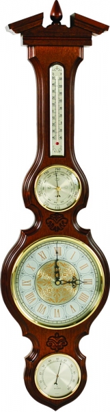 Метеостанция М-97 – это часы настенные, гигрометр, термометр и барометр в одном корпусе. Такой состав приборов не делает конструкцию какой-то особенно уникальной, чего не скажешь об удивительной цветовой гамме устройства: белый, золотистый, черный цвета и цвет слоновой кости придают всей композиции такой визуальный эффект, будто бы прибыла она к нас не с современного завода, а от мастера эпохи просвещенного абсолютизма. Корпус выполнен из массива высококачественной древесины. Цвет орех. Характеристики: