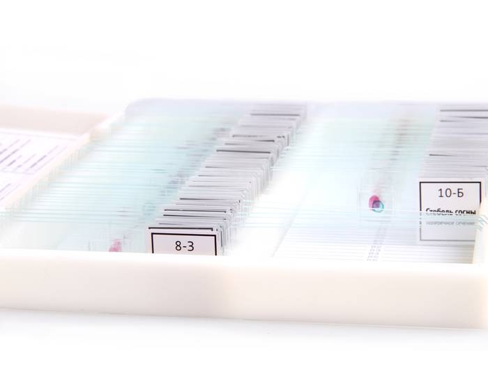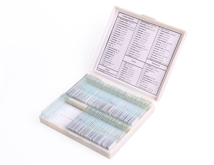 Набор готовых микропрепаратов содержит уже полностью подготовленные образцы биоматериалов. Каждый образец закреплен на предметном стекле и прикрыт покровным стеклом, стекла и биоматериал зафиксированы вместе.
