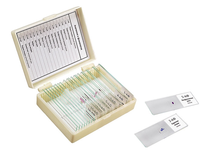 Учебный микропрепарат представляет собой предметное стекло с расположенным и закрепленным на нем объектом, уже подготовленным для исследования под микроскопом. Сверху объект накрыт тонким покровным стеклом. Размеры готовых препаратов стандартные (25 мм х 76 мм) и подходят для использования с любым биологическим микроскопом Микромед. 14 образцов, 10 предметных стекол, покровные стекла В наборе "Анатомия и Физиология" Микромед №2, 16 образцов