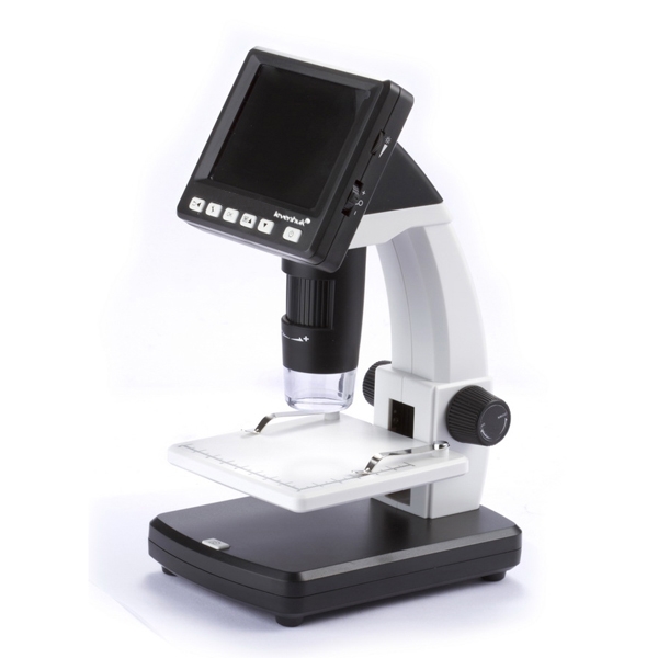 Цветной жидкокристаллический дисплей микроскопа имеет диагональ 3,5 дюйма. С помощью кнопок на корпусе можно регулировать яркость изображения, экспозицию и цветовой баланс. Микроскоп можно подключить к компьютеру с помощью стандартного кабеля USB и скопировать файлы с карты памяти. AV-выход позволяет выводить изображение из-под объектива микроскопа на телевизор или проектор в реальном времени.