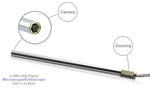 Цифровой микроскоп USB "Микрон эндоскоп" 2 Mpix (200 X Zoom, 6 LEDs) оборудован цифровой камерой CMOS-типа. Камера заменяет собой окуляр и соединяется с компьютером посредством USB кабеля. Это позволяет увидеть увеличенное изображение на экране компьютера или ноутбука в режиме реального времени, так как скорость передачи данных по порту достигает 480 Мбит/сек. Благодаря этой цифровой камере можно отказаться от традиционного метода работы с микроскопом (уткнувшись в окуляр) и просматривать изображение микроорганизмов на большом экране монитора. Это комфортнее, удобнее и безопаснее для здоровья. Кроме того, благодаря цифровой камере, микроскоп можно использовать для коллективного наблюдения за микромиром. В частности, изображение с него можно вывести на большой экран учебного проектора.