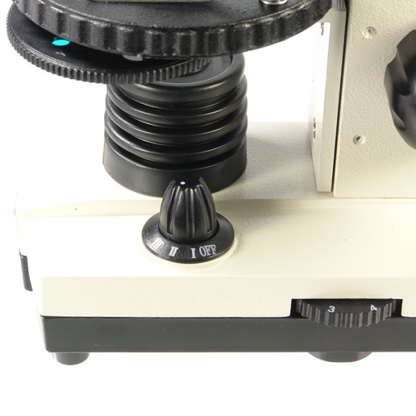 • Рукоятки грубой и тонкой фокусировки, расположенные по обеим сторонам штатива, обеспечивают точную настройку резкости изображения на большом увеличении. Рукоятки расположены на одной оси. Такая комфортная система фокусировки отличает этот микроскоп от других школьных моделей.