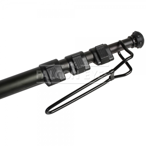 Снизу находится резиновый наконечник с выкручиваемым шипом — монопод одинаково удобно можно использовать, как на лакированной поверхности, так и на рыхлой земле. Монопод снабжается упором для ноги, становясь на который, достигается дополнительная устойчивость и фиксация. Рукоятка из вспененного материала служит для комфортной работы при отрицательных температурах и прочного удерживания без проскальзывания. Монопод снабжен ремешком для фиксации на руке, это предупредит падение монопода с камерой, если фотограф случайно выпустит его из рук. Монопод комплектуется чехлом на молнии.