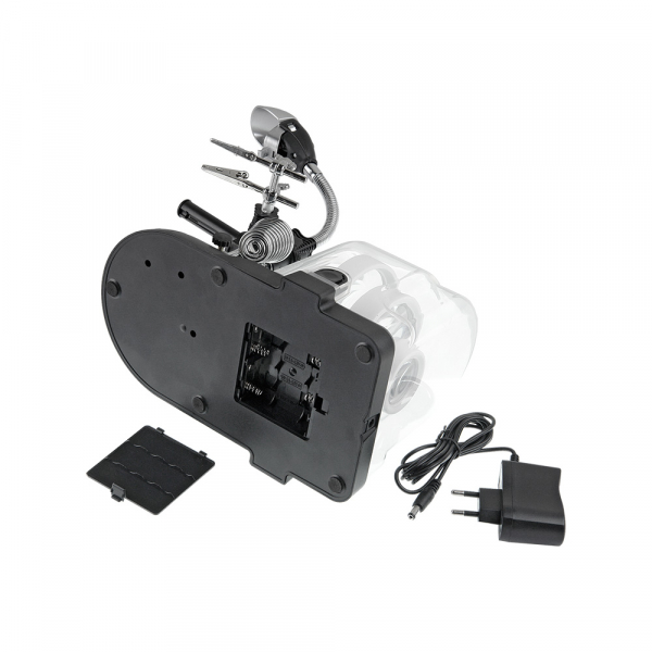 Набор луп с подсветкой Veber S-Clamp 3 с держателем «третья рука» Набор луп с держателем «третья рука» представляет из себя комплект из трёх луп, сменную ручку со светодиодной подсветкой, осветителя на гибкой штанге, кронштейна с тремя «крокодилами», подставки для паяльника. Всё это смонтировано на основании-базе. Каждая лупа может быть закреплена как на гибкой штанге, так и на ручке из комплекта. Питание двух светодиодов ручки осуществляется от трёх батареек ААА (в комплект не входят). Гибкая штанга с плафоном и светодиодами Гибкая штанга (длиной 105 мм) закреплена на металлическом стержне высотой 140 мм. На этом же стержне размещён поворотный кронштейн с «крокодилами», положение которого можно регулировать по высоте. На кронштейне расположена горизонтальная металлическая раздвижная (телескопическая) направляющая, на которой находятся три держателя типа «крокодил» с винтовой фиксацией их положения. Металлическую направляющую можно перемещать взад вперёд по направляющей кронштейна в пределах 54 мм (фиксация положения осуществляется нижней клипсой). Заклон штанги осуществляется ступенчато с винтовой фиксацией положения. На конце гибкой штанге находится регулируемый по наклону блок с шестью яркими светодиодами и гнездо для установки комплектных луп или защитного козырька. Кнопка включения подсветки расположена над блоком светодиодов. Основание-база Основание-база выполнена из АБС-пластика. На верхней передней части базы расположена металлическая накладка с закреплённой на ней держателем паяльника и металлическим стержнем с гибкой штангой. Тут же расположена и подпружиненная площадка с абразивной бумагой для чистки жала паяльника (для смены «наждачки» необходимо открыть защитную крышку с правой стороны базы). На задней части базы расположены держатели для луп, ручки и защитного колпака. Батарейный отсек (на четыре батарейки АА, в комплект не входят) находится на нижней части базы под защитной крышкой. Гнездо адаптера питания (адаптер в комплекте) находится с обратной стороны базы. Купить лупу Veber рекомендуется приобрести для проведения ремонтных работ в микроэлектронике, ювелирном деле, миниатюристам, сборщикам моделей и пр.