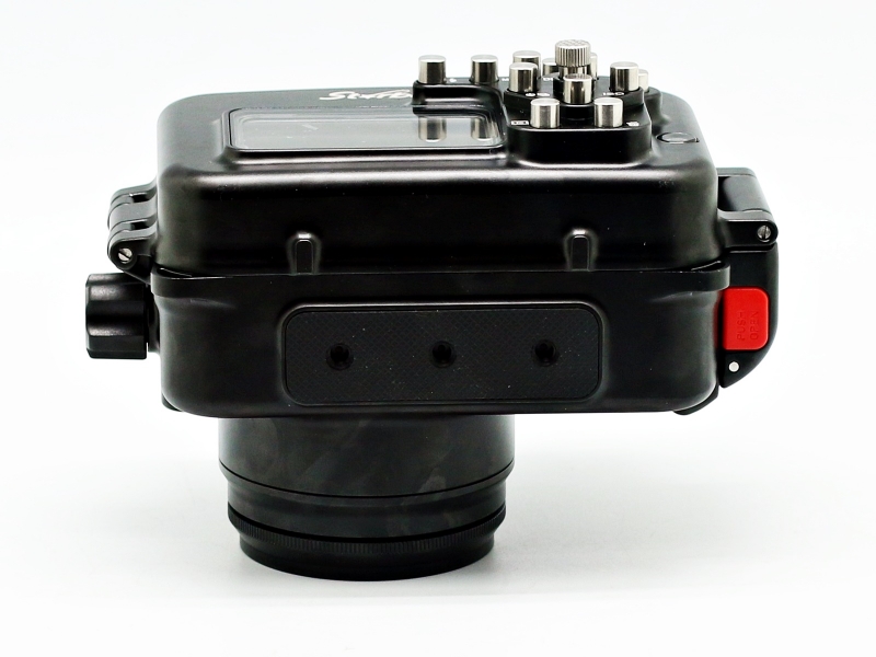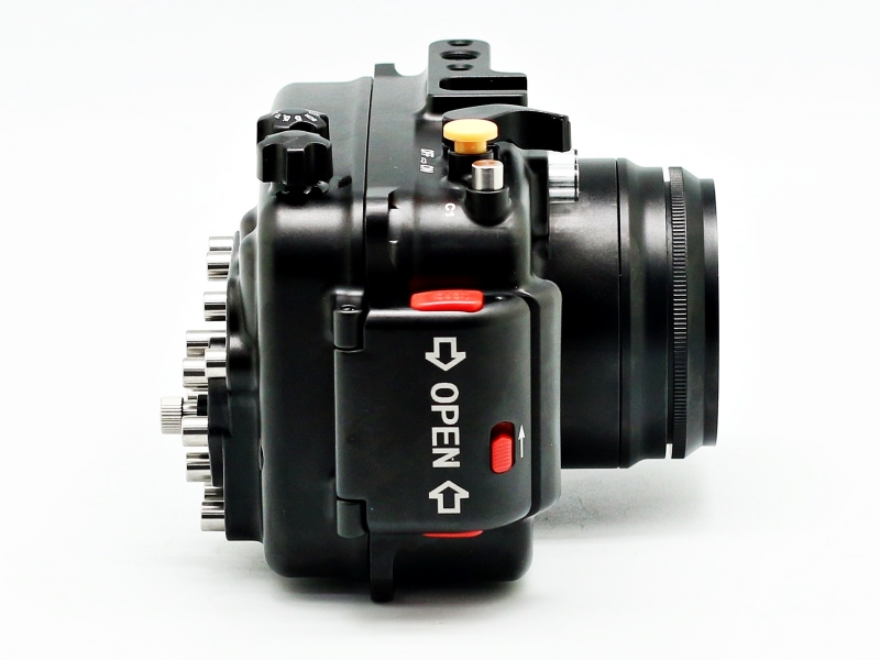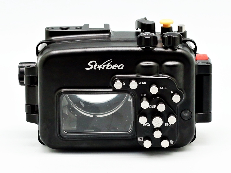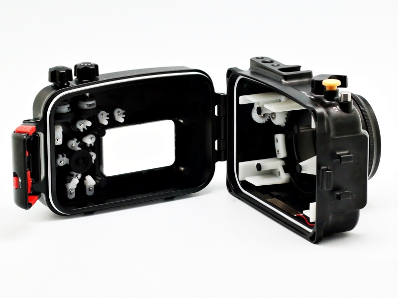 Подводный бокс выполнен из цельного блока твердого алюминиевого сплава. Фрезеруется на высокоточных станках и анодируется с учетом использование в морской воде. Этот ультра-прочный корпус имеет глубину погружения 100 метров в соленной воде. Бокс комплектется портом для объектива 16-50 мм. Он имеет датчик протекания со звуковым и световым сигналом, два оптических порта для подводной вспышки, также имеется резьба 67 мм для дополнительных оптических насадок и фильтров. Продуманная эргономика позволит Вам с удобством использовать все функции цифрового фотоаппарата.