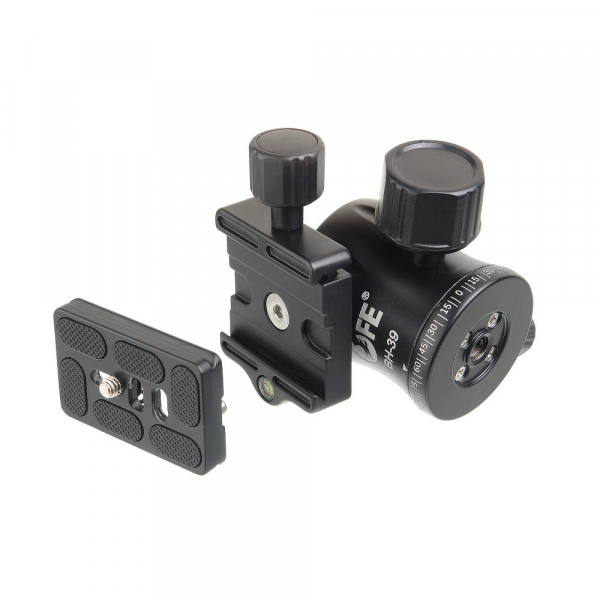 Штативная голова Falcon Eyes BH-39 Falcon Eyes ВН-39 — шаровая головка для установки камер на штативы и другие опоры с посадочным винтом 3/8”. Конструкция из алюминиево-магниевого сплава дает возможность быстро выбрать и надежно зафиксировать нужное для съемки положение камеры весом до 15 кг. Для крепления камеры служит быстросъемная площадка размером 60х38,5 мм с конгрессным винтом ¼” и резиновыми накладками. Площадка устанавливается в базу с пазами и фиксируется винтом. От случайного выпадения она застрахована 2 упорами. Для выравнивания положения камеры база оснащена пузырьковым уровнем. Свободное, без рывков движение шара позволяет плавно перемещать камеру, наклонять ее под углом до 90°. Наклон площадки закрепляется винтом с большой удобной рукояткой. Головка дает возможность горизонтального панорамирования на 360°. На поворотном диске в основании конструкции предусмотрена шкала с шагом 5°. Положение головки относительно шкалы фиксируется винтом. Прочное покрытие, нанесенное на корпус и шар методом глубокого анодирования, обеспечивает высокую износостойкость конструкции.