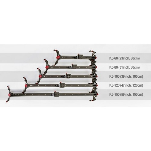 Доступны несколько моделей таких слайдеров, которые отличаются длиной рельс: 60 см (К3-60), 80 см (К3-80), 100 см (К3-100), 120 см (К3-120), 150 см (К3-150). Слайдер идеально подходит для съемки видео роликов, праздничных мероприятий, рекламы, а также пейзажей.