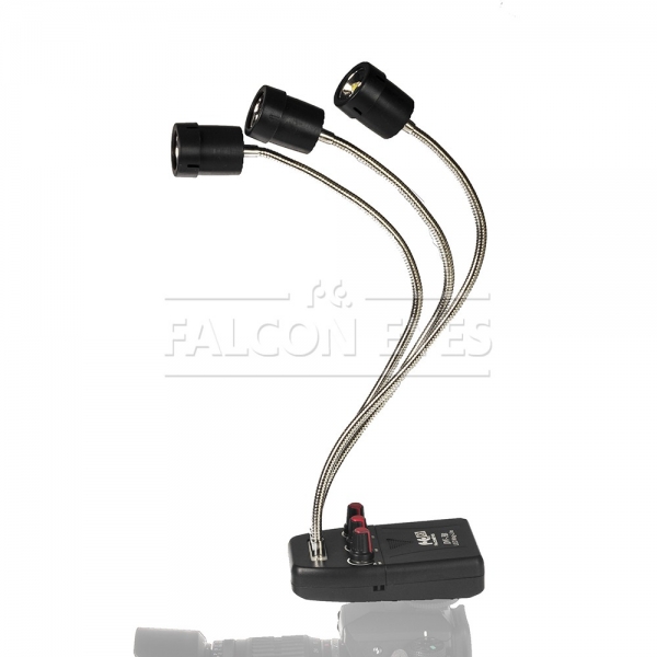 Falcon Eyes DV-3B — накамерный светодиодный осветитель для точечной подсветки, предназначен для использования в макросъемке . Осветитель состоит из 3-х отдельно регулируемых ламп-светодиодов мощностью 1 Вт каждая. Светодиоды закреплены на длинных гибких металлических штангах. Блок управления (основание) устанавливается на камеру с помощью крепления «холодный башмак», башмак снизу имеет бронзовую вставку с резьбой 1/4 дюйма для установки осветителя на штатив. С помощью 3-х ручек производится независимая плавная регулировка яркости каждого светодиода от 0 до 100%, а также включение/отключение питания. Угол освещения регулируется от 53° до 120°, в комплекте насадки для создания направленного узкого потока света. С помощью гибких штанг длиной 330 мм можно легко перемещать диоды в любое положение для достижения требуемого эффекта освещения. Для создания цветовых эффектов применяются сменные светофильтры из комплекта. В качестве элементов питания используются 4 батареи типа АА или соответствующие аккумуляторы (не входят в поставку).
