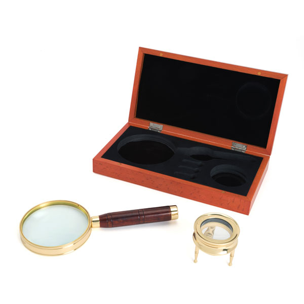 Celestron Ambasador 50 TT классический телескоп рефрактор из прочной латуни на штативе из красного дерева. Телескоп оснащен 50-мм объективом и зум окуляром 15-45х, который позволяет легко изменить увеличение телескопа легким поворотам окуляра. Полностью стеклянная оптика позволит вам детально рассмотреть не только наземные объекты, но и небесные. Телескоп установлен на стильном азимутальном латунном штативе и подставке из красного дерева, что предает телескопу неотразимый вид, который украсит вашу гостиную или офис. Элегантный набор из двух луп в оригинальных дизайнерских оправах в красивой коробке из красного дерева. Этот комплект замечательно впишется в интерьер на рабочем столе в вашем офисе или дома. 90-мм лупа имеет увеличение 2х и заключена в оправу из латуни с деревянной ручкой, а настольная лупа имеет увеличение 4 крата и заключена в дизайнерскую оправу-подставку. Этот набор особенно подходит для любителей марок.