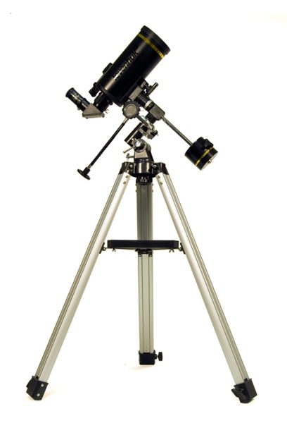 Линзовые поверхности телескопа имеют просветляющее покрытие, которое обеспечивает максимальное светопропускание, а отражающие – защитный слой, увеличивающий срок их службы. Очень компактная и легкая алюминиевая труба установлена на экваториальную монтировку, оснащенную ручками тонких движений и допускающую установку электропривода часовой оси (приобретается отдельно). Такая монтировка имеет специальные координатные круги, с помощью которых, после несложной настройки, можно находить объекты по их экваториальным небесным координатам, а также сопровождать суточное движение объекта вращением только одной ручки. Тренога регулируется по высоте и имеет удобную полочку для принадлежностей, а коллиматорный искатель с красной точкой позволит быстро навести телескоп на нужный участок неба. С телескопом поставляются 2 окуляра, имеющие поле зрения 52 градуса и фокусные расстояния 10 мм и 25 мм и дающие с телескопом увеличение 125 и 62 крат. Линзы окуляров изготовлены из стекла и имеют многослойное просветление. Фокусировка выполняется подвижкой главного зеркала с помощью удобной ручки с плавным ходом. Посадочный диаметр под окуляры стандарта 1,25” (31,75 мм) позволяет использовать с телескопом множество других имеющихся на рынке окуляров, помимо входящих в комплект. С их помощью увеличение телескопа может быть поднято до полезного предела в 180 крат. На выходной втулке имеется стандартная Т-резьба, которая, через дополнительное переходное кольцо, позволяет присоединять к телескопу зеркальную фотокамеру и производить съемку Луны и других ярких объектов.