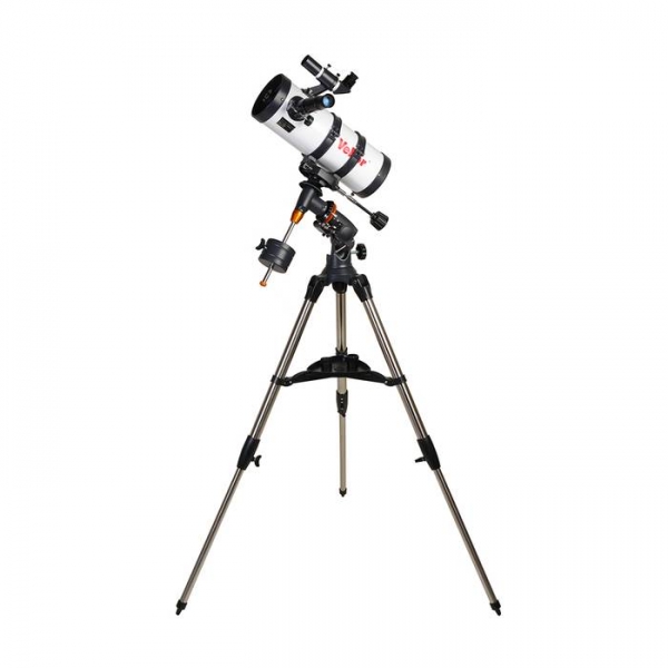 Телескоп Veber Polarstar 1000/114 EQ — оптимальная модель для серьезных, но начинающих любителей астрономии. Зеркало диаметром 114 мм достаточно велико, чтобы собирать много света (в этот телескоп вы сможете увидеть объекты солнечной системы во всех подробностях — таких как щель Кассини в кольце Сатурна, лунные кратеры размером ок.5 км, слабые звезды до 13 m зв. величины). Однако, габариты прибора вполне «домашние», длина трубы всего 42 см. С окуляром PL25 вы получите увеличение 40х, с которым удобно вести наземные наблюдения. При этом ближняя точка фокусировки составит всего 12 м. Очень стильное исполнение телескопа: белая глянцевая металлическая труба в обрамлении выглядящих брутально крышек, металлическая монтировка с декоративными оранжевыми элементами, мощный штатив из полированной нержавейки… Удобный 90 градусный искатель (увеличение 6х) расположен рядом с окуляром. Прибор оснащен монтировкой немецкого типа EQ5 с возможностью подключения электропривода (для постоянного наблюдения за выбранным объектом). Многие другие фирмы, в целях удешевления, устанавливают такие телескопы на монтировку EQ1, которая является для них откровенно слабой. Вся конструкция:телескоп-монтировка-штатив должна быть достаточно жесткой и гасить дрожания и колебания которые мешают наблюдениям. В данном телескопе стальной штатив имеет еще и дополнительные распорки, на которые устанавливается столик для аксессуаров.