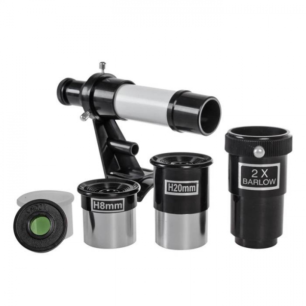 Установка окуляров. Окуляр - оптический элемент, который увеличивает изображение, создаваемое телескопом. Окуляр вставляется в трубу фокусировочного узла, с которой предварительно нужно снять заглушку. Винты не должны входить вглубь трубки фокусировочного узла. Вставьте хромированную часть окуляра в трубу фокусировочного узла и подожмите винты. Поиск объекта следует начинать, используя видоискатель телескопа. После наведения видоискателем на объект, установите окуляр малого увеличения (15х) и произведите фокусировку с ним. Затем увеличение можно повысить до 37,5х заменив окуляр описанным выше способом. Если между окуляром и трубой фокусировочного узла установить линзу Барлоу, увеличение телескопа станет больше ровно в 2 раза. Наведение телескопа. Установите телескоп на стол или другую устойчивую опору с ровной поверхностью. Телескоп легко вращается в любом направлении. Ослабьте зажим винта-фиксатора (вращая его против часовой стрелки) и придержите заднюю часть трубы. Глядя вдоль трубы телескопа в видоискатель, наведите его на интересующий объект, передвигая заднюю часть трубы, и поместив объект в поле зрения, зажмите винт-фиксатор. Ориентация изображения. При наблюдении через окуляр с задней части или сбоку от трубы телескопа, изображение в окуляре будет перевернутым или под углом. Фокусировка. Производится поворотом ручки фокусировки. После смены окуляров нужно проводить повторную фокусировку. Наблюдение луны. Лучшее время для наблюдения деталей рельефа луны - не полнолуние, а частные фазы (около первой и последней четверти). Для комфортного наблюдения следует использовать лунный фильтр. Наблюдение планет. Яркие планеты - Венера, марс, Юпитер, Сатурн - увлекательные объекты для наблюдений. для наблюдения планет нужно знать их положение на звездном небе в данный момент времени. Наблюдение объектов глубокого космоса. Для поисков этих объектов (галактик, туманностей и звездных скоплений) удобно использовать звезды-ориентиры, перемещая телескоп от звезды к звезде в направлении объекта поиска. Наблюдение наземных объектов. Просто наведите телескоп на интересующий объект и произведите фокусировку. Окуляры и увеличение. Телескоп поставляется с двумя различными окулярами - 20 мм (увеличение 15 крат) и 8 мм (увеличение 37,5 крат). При установке линзы Барлоу увеличение телескопа увеличивается в 2 раза