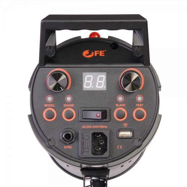 Для управления моделирующей лампой предусмотрен отдельный регулятор мощности и кнопка включения/отключения. Лампа автоматически отключается через 2 часа, во избежание перегрева при работе, когда пользователя нет на месте. В моноблоках Falcon Eyes Sprinter установлена галогенная лампа мощностью 150 Вт, цоколь Е27. При помощи приобретаемого отдельно адаптера можно использовать лампы с цоколем G6.35. Максимальная рекомендуемая мощность лампы накаливания (галогенной) с цоколем Е27 — 650 Вт, при использовании пилотного света с лампой мощностью 500 Вт и выше в течение часа, возможен перегрев насадок, в особенности не жаропрочных софтбоксов. Будьте осторожны!