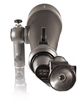 Подзорная труба ЗРТ-457 от Казанского оптико-механического завода – это мощный и надёжный оптический наблюдательный прибор. Данная модель имеет окуляр с 2 фиксированными увеличениями 30х и 60х, которое изменяется поворотом переключателя увеличения на 180° вокруг своей оси. Прочный металлический корпус окрашен в чёрный цвет. Съёмная металлическая бленда помогает защитить линзы объектива от паразитных солнечных бликов (при наблюдении в яркую солнечную погоду или при изучении объектов на поверхности воды). Наведение резкости на объект наблюдения осуществляется с помощью большого барабанчика регулировки (с продольными насечками), расположенного в окулярном узле. Наличие целика облегчает поиск объектов и позволяет выполнить предварительную наводку трубы на цель.